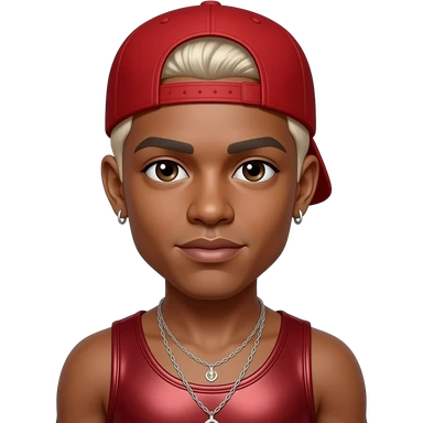 Raz-B from B2K with dark brown eyes, platinum blonde caesar cut hair, red hat, deep red metallic tank top, necklace and earrings emoji