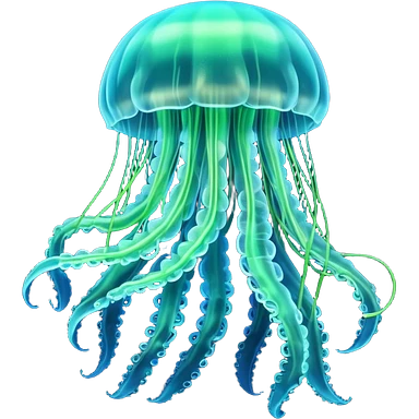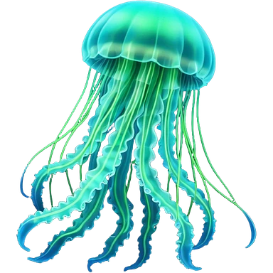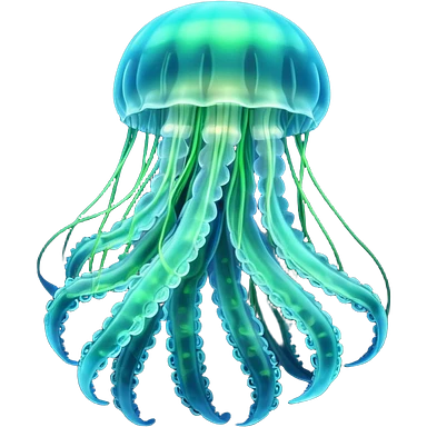3D render of Jellyfish, bioluminescent deep sea style, glowing neon blue and green lights, dark background to contrast the glow, translucent organic textures. emoji