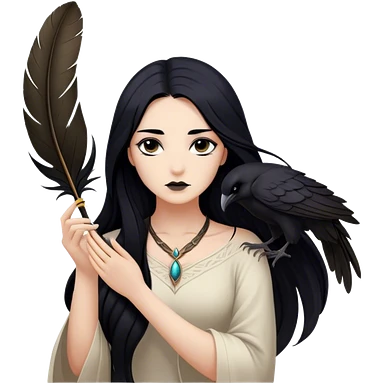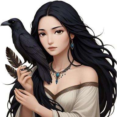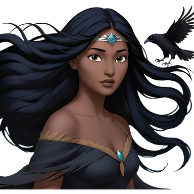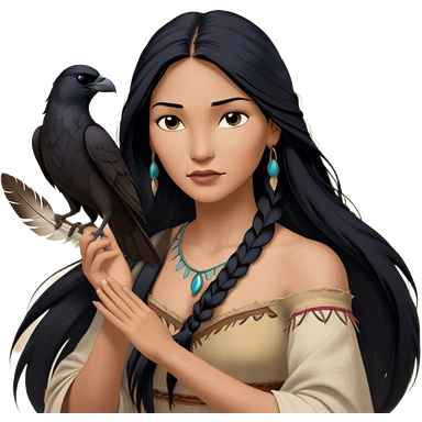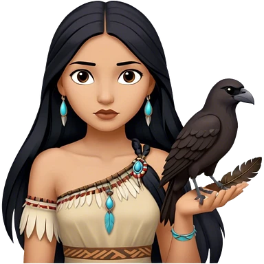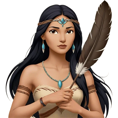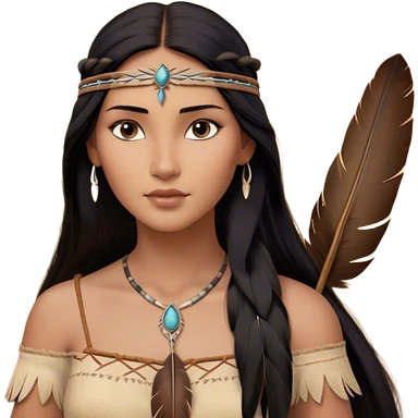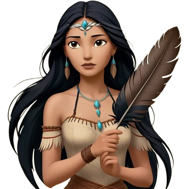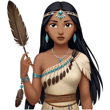 Cinematic Realistic Pocahontas Portrait, depicted with lifelike skin texture, soft natural lighting, and intricately detailed long, flowing raven-black hair that moves gracefully in the wind. Her deep, soulful dark brown eyes exude wisdom and strength, complemented by a serene yet powerful expression. She is shown gently holding a feather in one hand, her other hand resting lightly at her side, embodying the harmonious balance between nature and herself. She is dressed in her classic one-shoulder native American dress, with rich fabric textures and delicate beaded details that catch the light beautifully. The portrait features a soft, sun-kissed glow with a natural, radiant finish, capturing the essence of untamed beauty and deep connection to nature in a realistic and painterly style, evoking a sense of depth and authenticity. emoji