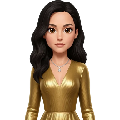 Gal Gadot with brown eyes, black long hair, gold metallic long sleeve dress, silver necklace emoji