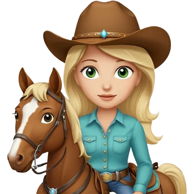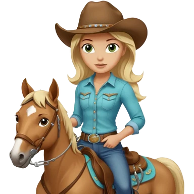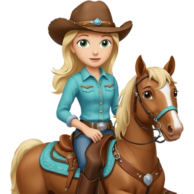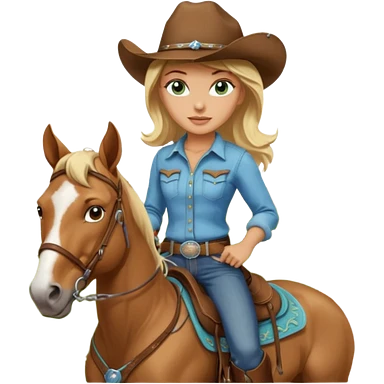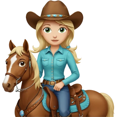 one blonde with light blue green eyes cowgirl on a quarter horse emoji | AI Emoji Generator