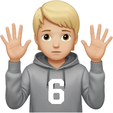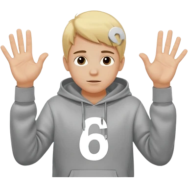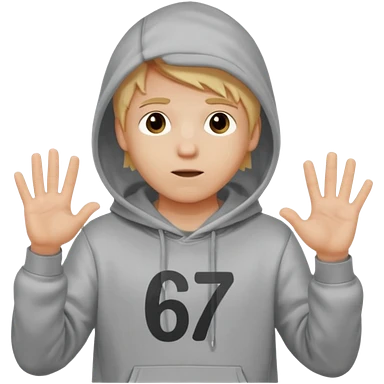 a white kid blone hair with a grey hoodie and his above his hands saying 67 one 6 on 1 hand 7 on the other emoji