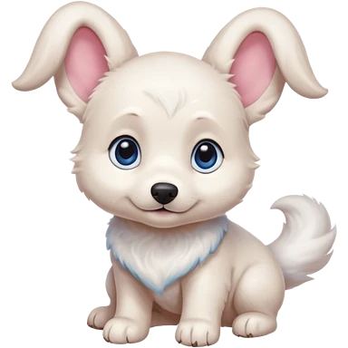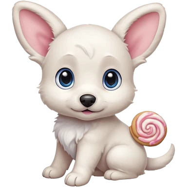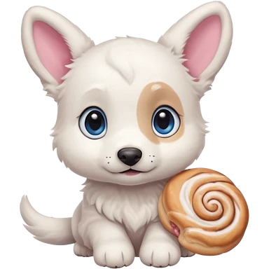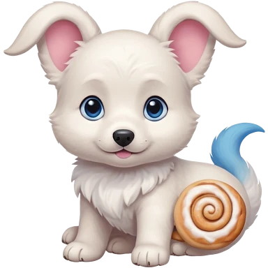 a shy but friendly white puppy with long ears that let him fly, blue eyes, pink cheeks, and a tail shaped like a cinnamon roll emoji