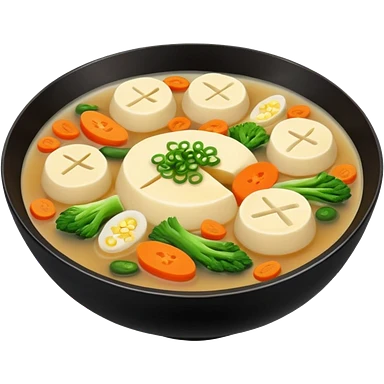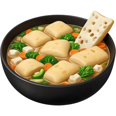 A black bowl filled with soft, uneven pieces of dough floating in a clear Korean broth, with sliced vegetables on top. Soft, flat dough pieces torn by hand into random shapes—some oval, some triangular, and some wavy—with rough, natural-looking edges. emoji