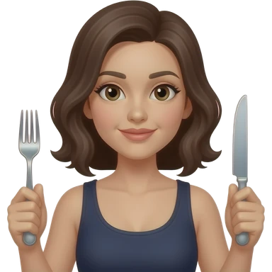 A woman is holding a fork in one hand and a knife in another emoji