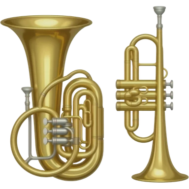 Create a professional and polished emoji representing the Brahner trumpet. The design should showcase the shiny brass body of the trumpet, with its distinct valves and bell. Highlight the smooth curves of the tubing and the elegant flared bell at the end. The valves should be visible with their metal buttons, and the mouthpiece should be positioned at the top of the instrument. Use bright gold and brass tones with reflective light effects to emphasize the trumpet’s polished, high-quality finish. Add subtle musical notes around the trumpet to evoke its bright, bold sound. The background should be transparent. emoji