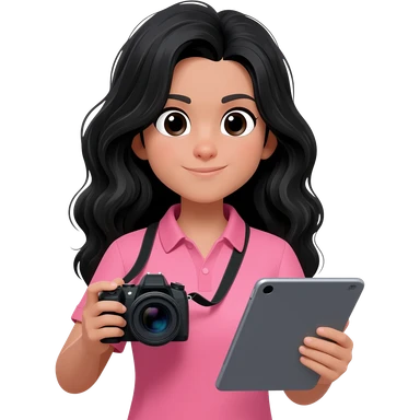 MAKE A CONTENT CREATION GIRL WITH BLACK WAVY AND LONG HAIR, WITH A PINK SHIRT, SHE HAS A CAMERA ON ONE AND AND A TABLET IS ANOTHER, LIKE SHE IS PLANNING SOMETING emoji