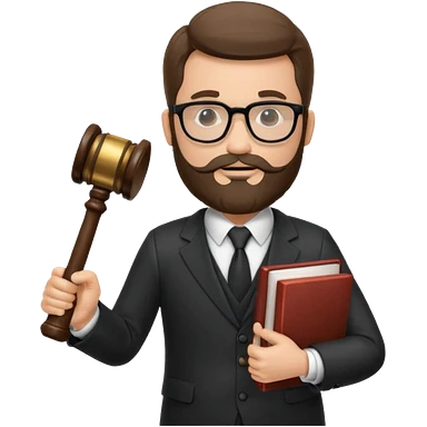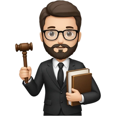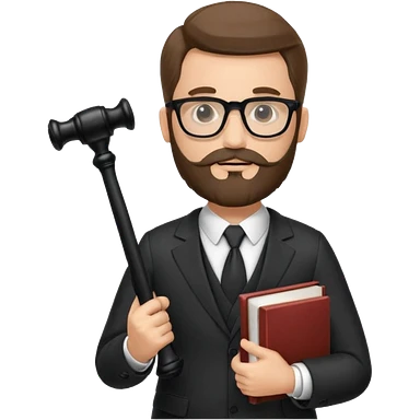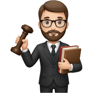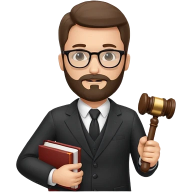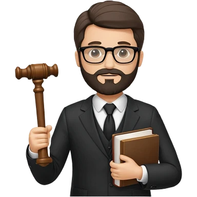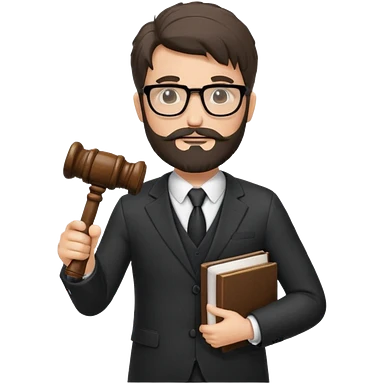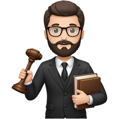 Create a male lawyer. he is wearing a fromal suit jckeret. He is holding a gavel in one hand and a book tucked under his another arm. He has beard and glasses without the glass lol. And the hair is kinda darker but not black emoji