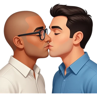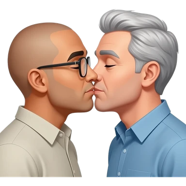 One has glasses and is bald and Mexican skin color. Gay men kissing romantically. The other guy is white and has silver daddy hair but is 40 years old. White and black striped hair. He is young 40 emoji | AI Emoji Generator