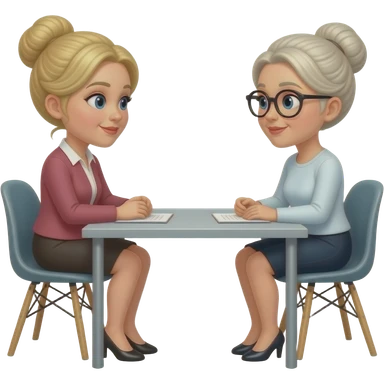 one-on-one meeting with two women, one blonde one blonde-grey updo and black-framed glasses sitting at a table across from each other emoji