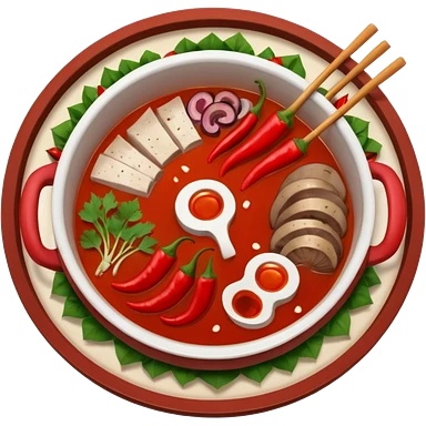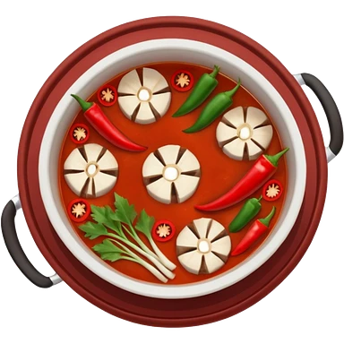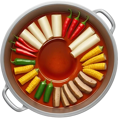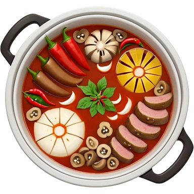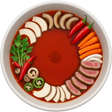 A hot pot emoji in top-down view. The pot is divided into two sections: one with spicy red broth filled with chili peppers, and one with mild white broth. Surround the pot with rolled slices of meat, vegetables, and mushrooms.The meat outside the pot emoji