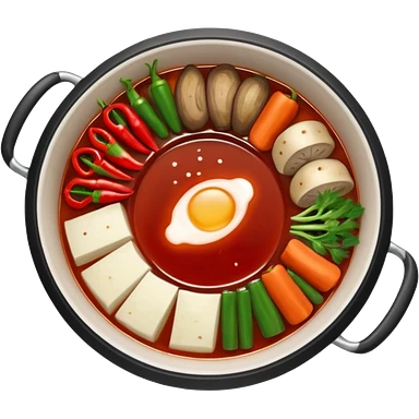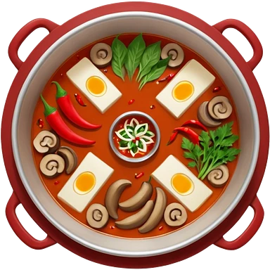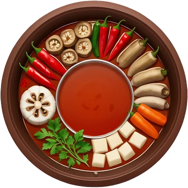A hot pot emoji in top-down view. The pot is divided into two sections: one with spicy red broth filled with chili peppers, and one with mild white broth. Surround the pot with rolled slices of meat, vegetables, and mushrooms. emoji