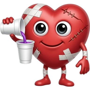 anthropomorphic heart with Spiral Eyes and stitches and bandages and cracks holding a white styrofoam double cup pouring out a purple liquid from it with one hand emoji
