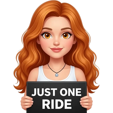 sexy girl with long wavy ginger hair and ginger eyes wearing a white tanktop is holding a black colored sign with JUST ONE RIDE written on it emoji