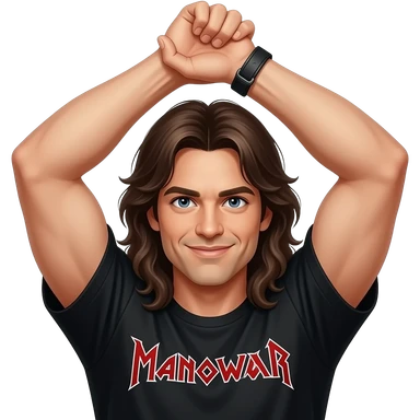 Only To arms held wide over the head and the left hand grabs the right wrist and the person should have Long hair and a black Manowar shirt emoji