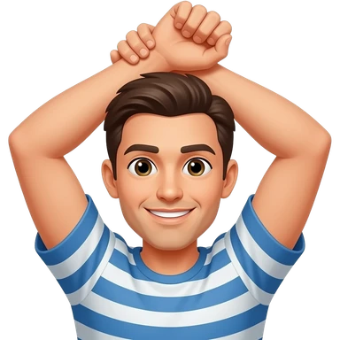 Both arms held over the head. the left hand holds the right wrist and the person should have Long hair and a black Manowar shirt. Not one hand holds the other. Its the wrist emoji