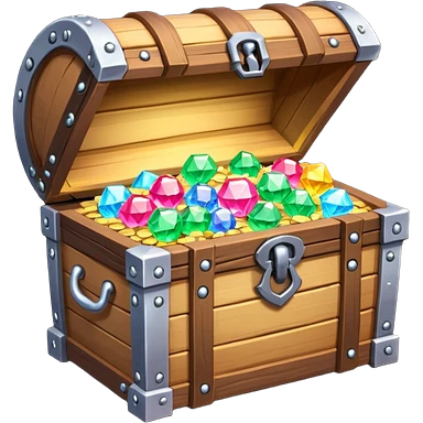 treasure chest with iron fittings and cold corners open and stacked full of a mix of gold coins a shiny gems emoji