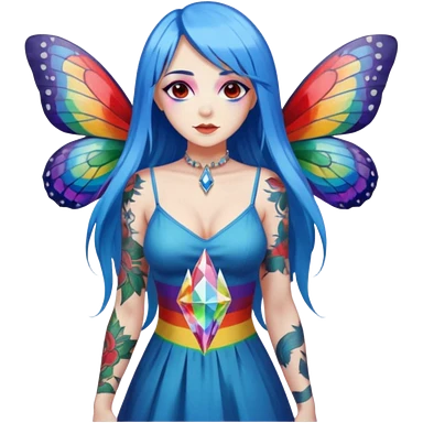 woman-long-blue-hair-red-eyes-white-skin-tattoos-big-breast-wearing-rainbow-crystal-shard-dress,-moths-orbiting,-flirty-contrapposto-pose emoji