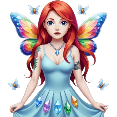woman-long-red-hair-blue-eyes-white-skin-tattoos-big-breast-wearing-rainbow-crystal-shard-dress,-moths-orbiting,-flirty-contrapposto-pose emoji