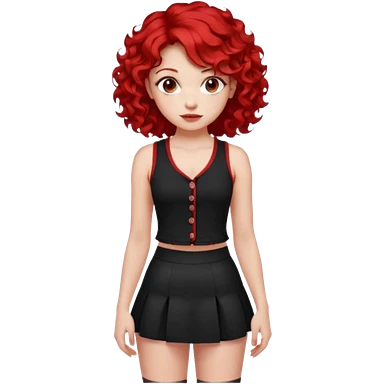 red haired girl with 2 big curls on the sides of her hair with a button up black tank top with red accents and a short skirt with red end emoji