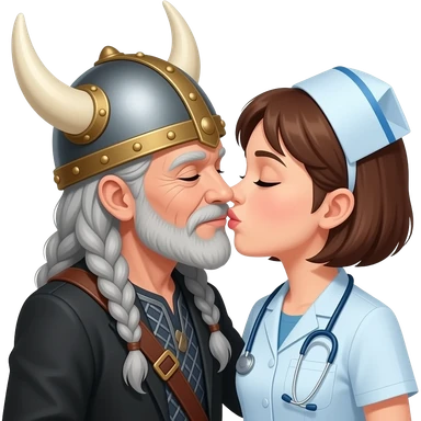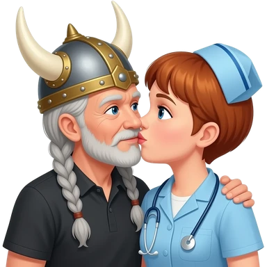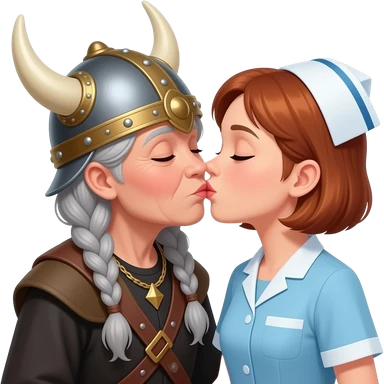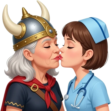 Viking helmet female opera singer older woman with gray braids kissing shortest brown hair nurse couple emoji