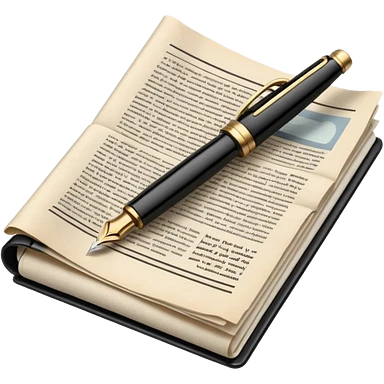 Create an emoji representing journalism and publicistic writing. The design should feature an open newspaper or a stack of articles with visible text columns, symbolizing opinion pieces and analysis. A classic fountain pen or ballpoint pen should be placed near the papers, indicating the act of writing. Optionally, include a small microphone or a press badge to emphasize investigative and journalistic aspects. Use neutral and professional colors like black, white, and muted blue or red. Do not include any emojis or smiley faces. Make the background transparent. emoji