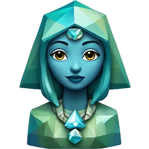 Sculpture oracle priestess with a geometric faceted design with disney features. Oracle of delphi is sparkling and standing upright on a base with angular and flower features. The vibrant blues neutrals and greens highlights the sharp edges and planes. emoji