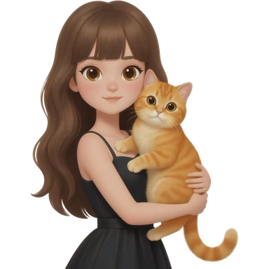 british Baby cat orange with girl long brown hair And black dress and bang hair emoji