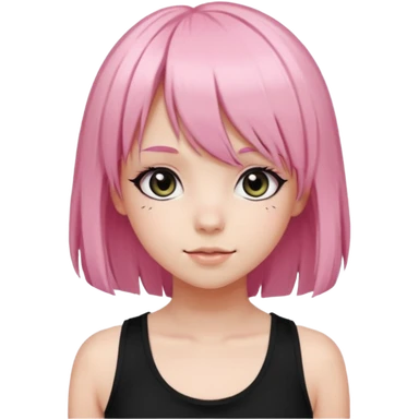 A girl with light pink hair with big black pupils and long manga style lashes and bangs wearing a black tank emoji