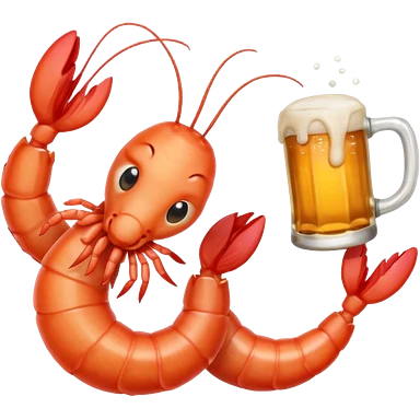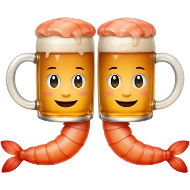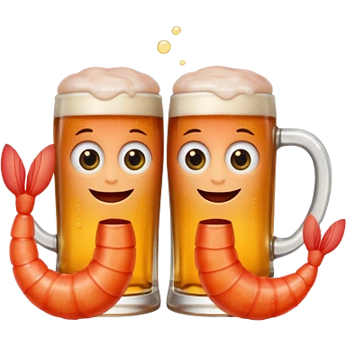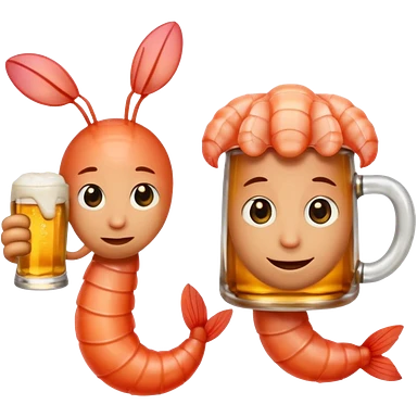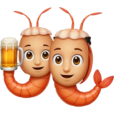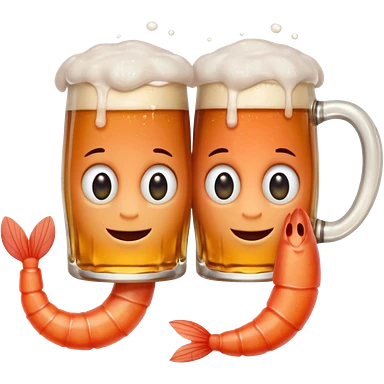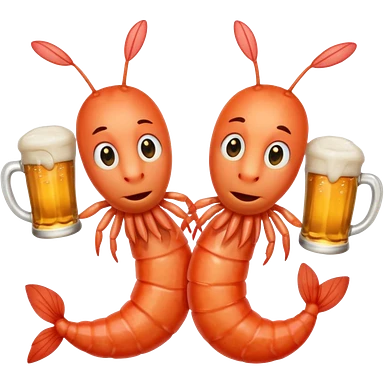 Design a trendy emoji-style illustration of two shrimp peeking from behind text, only half of their bodies visible, curious and playful expressions. One shrimp holding a beer mug, the other pointing forward. emoji