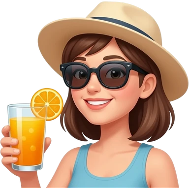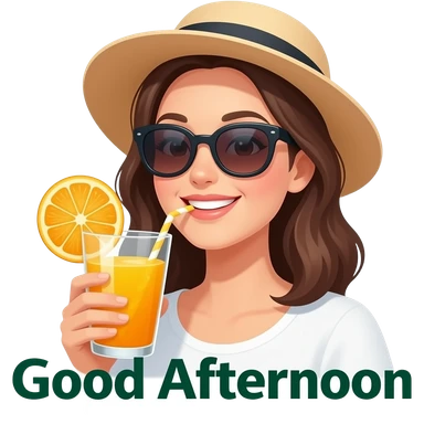 a woman in wearing sunglasses and a sun hat lifting a glass of orange juice with a slice of orange on the rim close to the camera with the words 'Good Afternoon' in dark green printed across the screen emoji