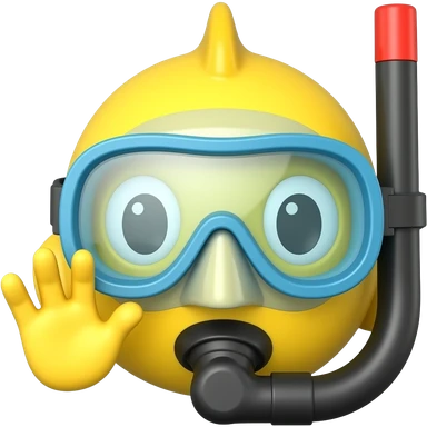 A regular yellow circle face emoji but it has scuba goggles and snorkeling gear on its face only the face and it’s hand is waving in the front like the motion of a fish so it looks like a handshake going to greet you, but it’s waving emoji