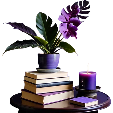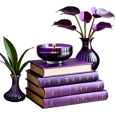 An elegant still life composition featuring a carefully arranged stack of books in shades of light and dark violet, their covers slightly worn, hinting at wisdom and time. A gracefully potted monstera plant with lavender-colored leaves extends its delicate, sculptural foliage, casting soft shadows. A glass candle holder in a rich purple orchid hue sits nearby, its surface reflecting ambient light. To complete the scene, a silky mauve ribbon drapes over the books, and a subtle lilac-hued ceramic vase holds a single dried flower, enhancing the refined and serene atmosphere. emoji