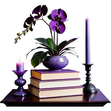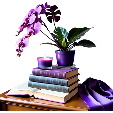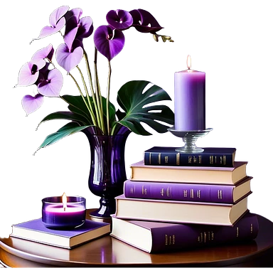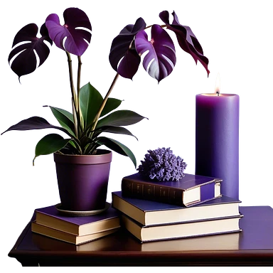 A sophisticated and artistic still life arrangement: a balanced stack of hardcover books in light and dark violet tones, their spines aligned in harmonious contrast. A lavender-colored monstera plant flourishes beside them, its uniquely shaped leaves adding a touch of organic beauty. A deep purple orchid glass candle holder glows gently, radiating warmth. To enrich the composition, a decorative amethyst crystal catches the light, a soft plum-colored linen cloth cascades from the table’s edge, and a delicate lavender-scented candle completes the ambiance of refined tranquility. emoji