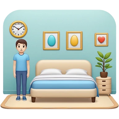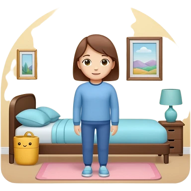 cozy clean room with neatly organized objects, simplified human character standing peacefully, feeling satisfied and calm, sense of order and balance, flat custom emoji sticker, pastel colors, rounded shapes, minimal details, thick outline, white background, no text emoji