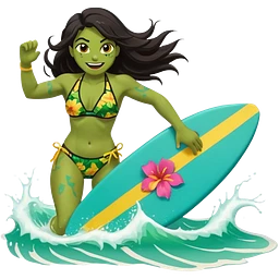 ork female holding small yellow bodyboard, running through shallow turquoise waves, muscular green body, bright floral bikini, fierce joyful grin showing tusks, long wet dark hair splashing, foam and spray, minimalist beach and ocean background, centered emoji, vibrant summer colors, sticker styleemoji