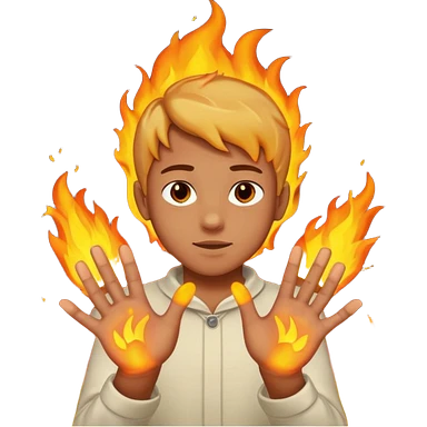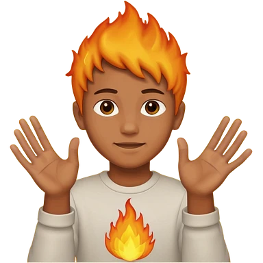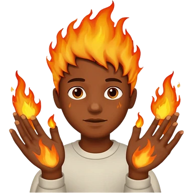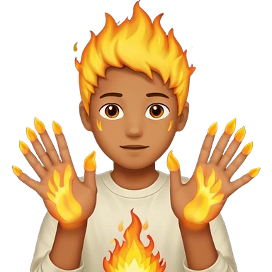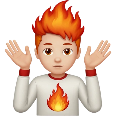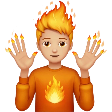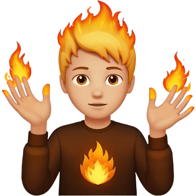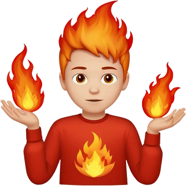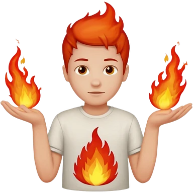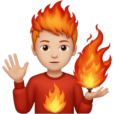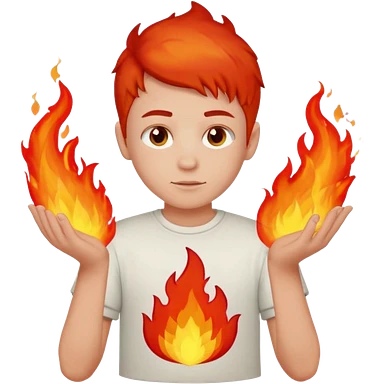 A boy with no hands fire instead made out of red fire and the boy is wearing a shirt that says FIRE CREATOR emoji