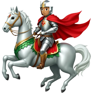 A knight in silver armor with a red cape, riding a white horse atop a green dragon. emoji