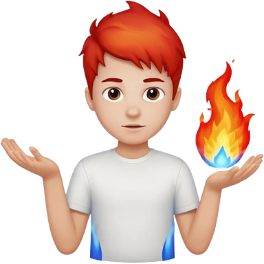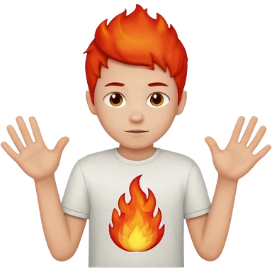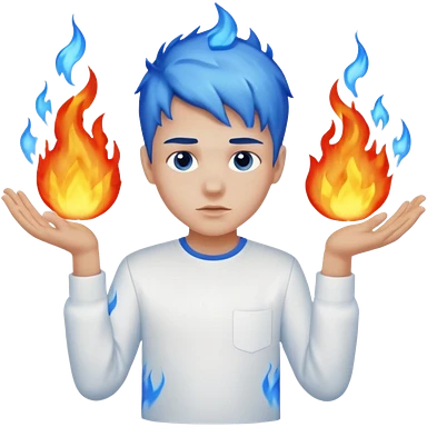 A boy with no hands fire instead made out of fire and blue fire on a white shirt that the boy is wearing emoji
