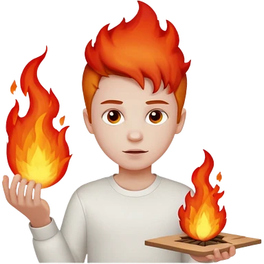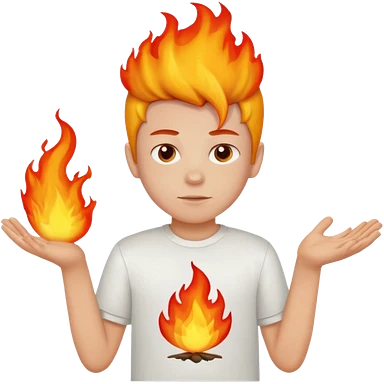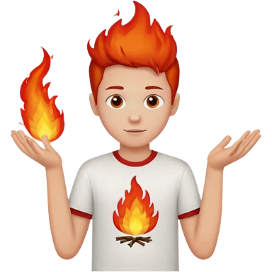 A boy with no hands fire instead made out of red fire and the boy is wearing a white shirt that has a sign that says FIRE CREATOR emoji
