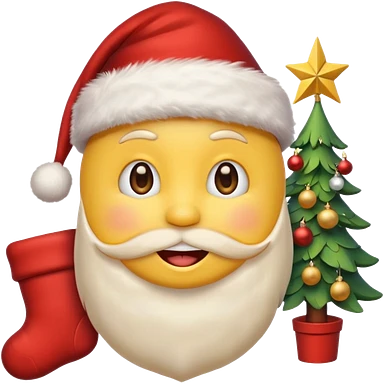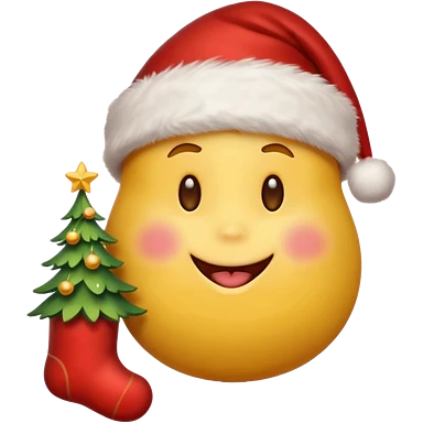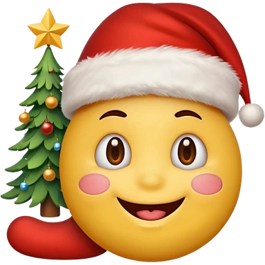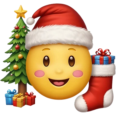 cute emoji face wearing a Santa hat, with a happy soft expression. Replace the festive Christmas elements: a Christmas tree, stocking, snowflake, and other holiday icons. emoji