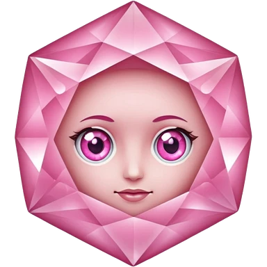 A single cute pink crystal cluster character, chunky round base with many tall rose-pink crystal quartz cluster imperfect, on the front of the base a kawaii face with big shiny eyes and a happy open smile very shiny emoji