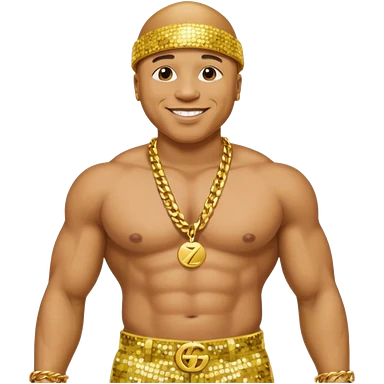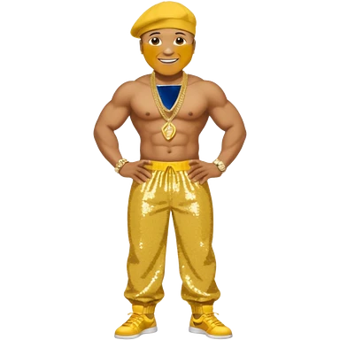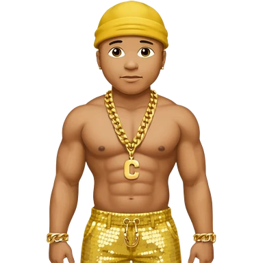 LL Cool J with yellow sequin baggy pants, shirtless with necklace emoji