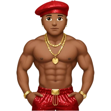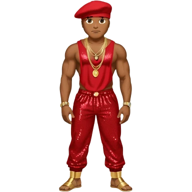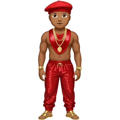 LL Cool J with red sequin baggy pants, shirtless with necklace emoji