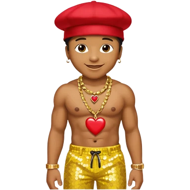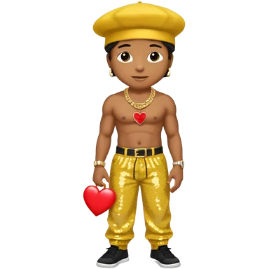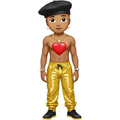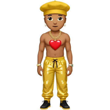 LL Cool J with yellow sequin baggy pants, shirtless with necklace with red heart, black hat emoji
