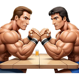 Arnold Schwarzenegger and Sylvester Stallone from 'Over the Top,' locked in an arm wrestling battle, using only their right hands. Their left hands rest on the table. Both display immense strength, with muscular arms flexing, under bright competition lights. Transparent background. emoji