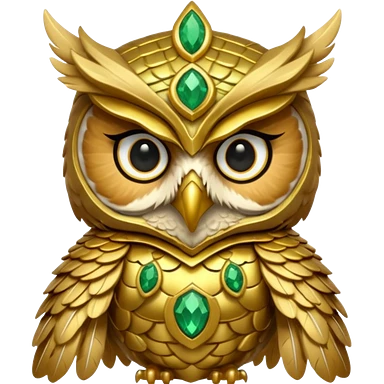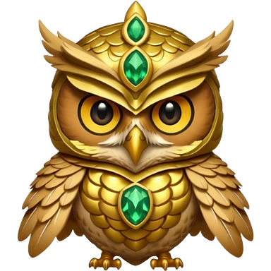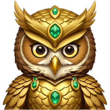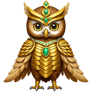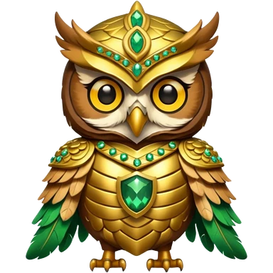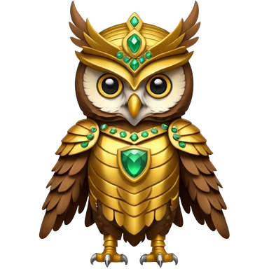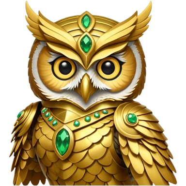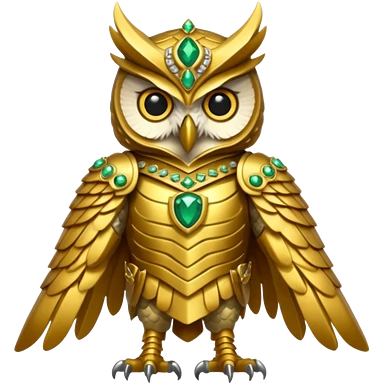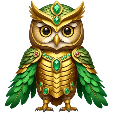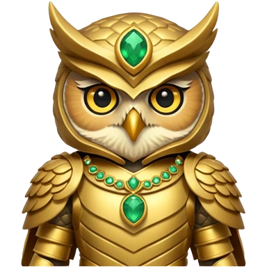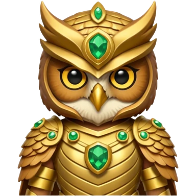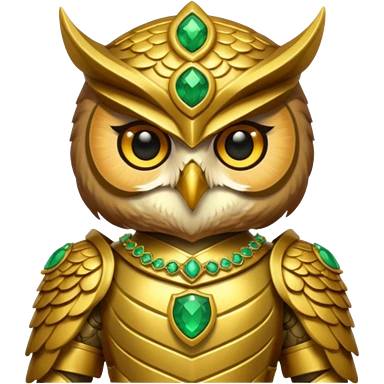 owl warrior wearing golden armor embedded with emerald jewels emoji