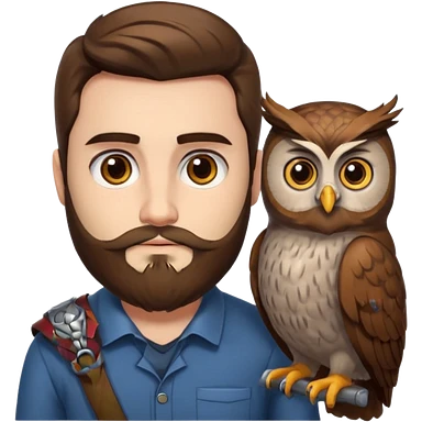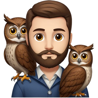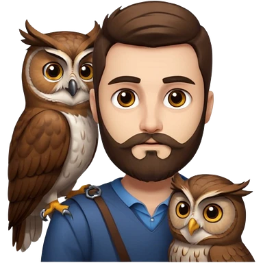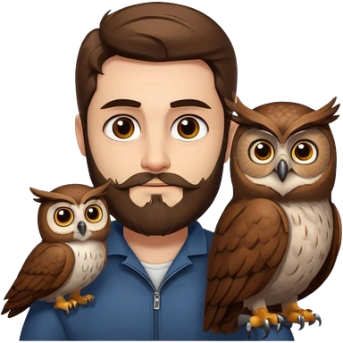 portrait man long brown hair brown eyes medium beard white skin with owl perched on shoulder emoji