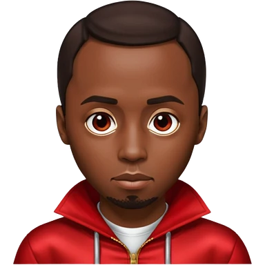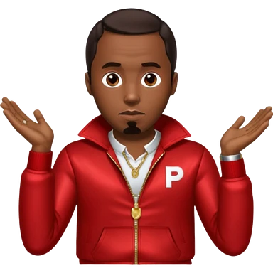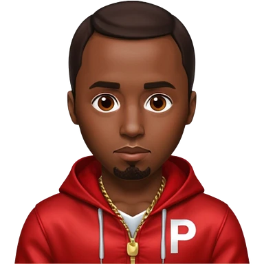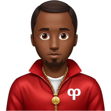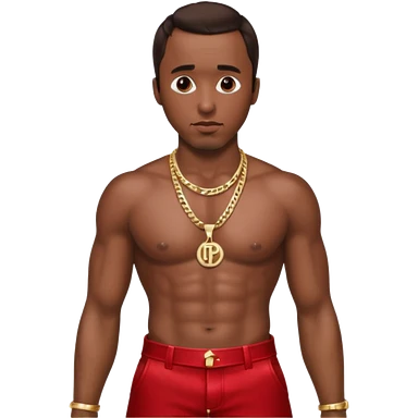P Diddy with dark brown hair, metallic red pants, shirtless with necklace emoji