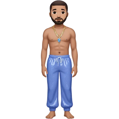 Drake with dark brown hair, periwinkle sequin baggy pants, shirtless with necklace emoji